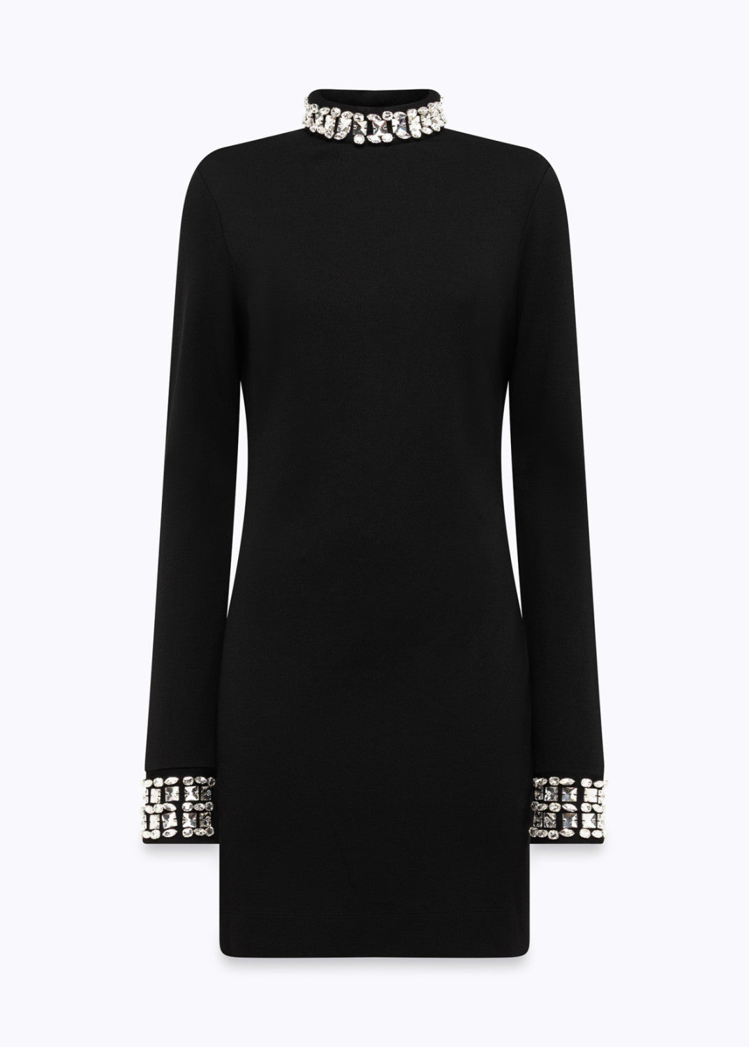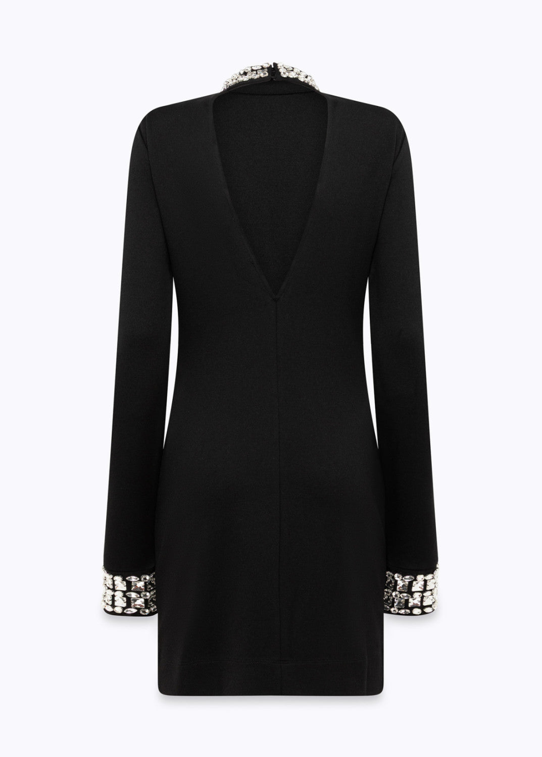ALLURE SPECIALE IN UN ATTIMO CON L'ABITO CORTO IN JERSEY DI VISCOSA STRETCH DECORATO DA RICAMO FATTO A MANO DI CRISTALLI. HA SCOLLATURA A V PROFONDA SUL RETRO, MANICHE LUNGHE, CHIUSURA CON BOTTONI E ASOLE, LINEA FITTED. UN JEWEL DRESS CHE NON PASSERÀ INOSSERVATO.