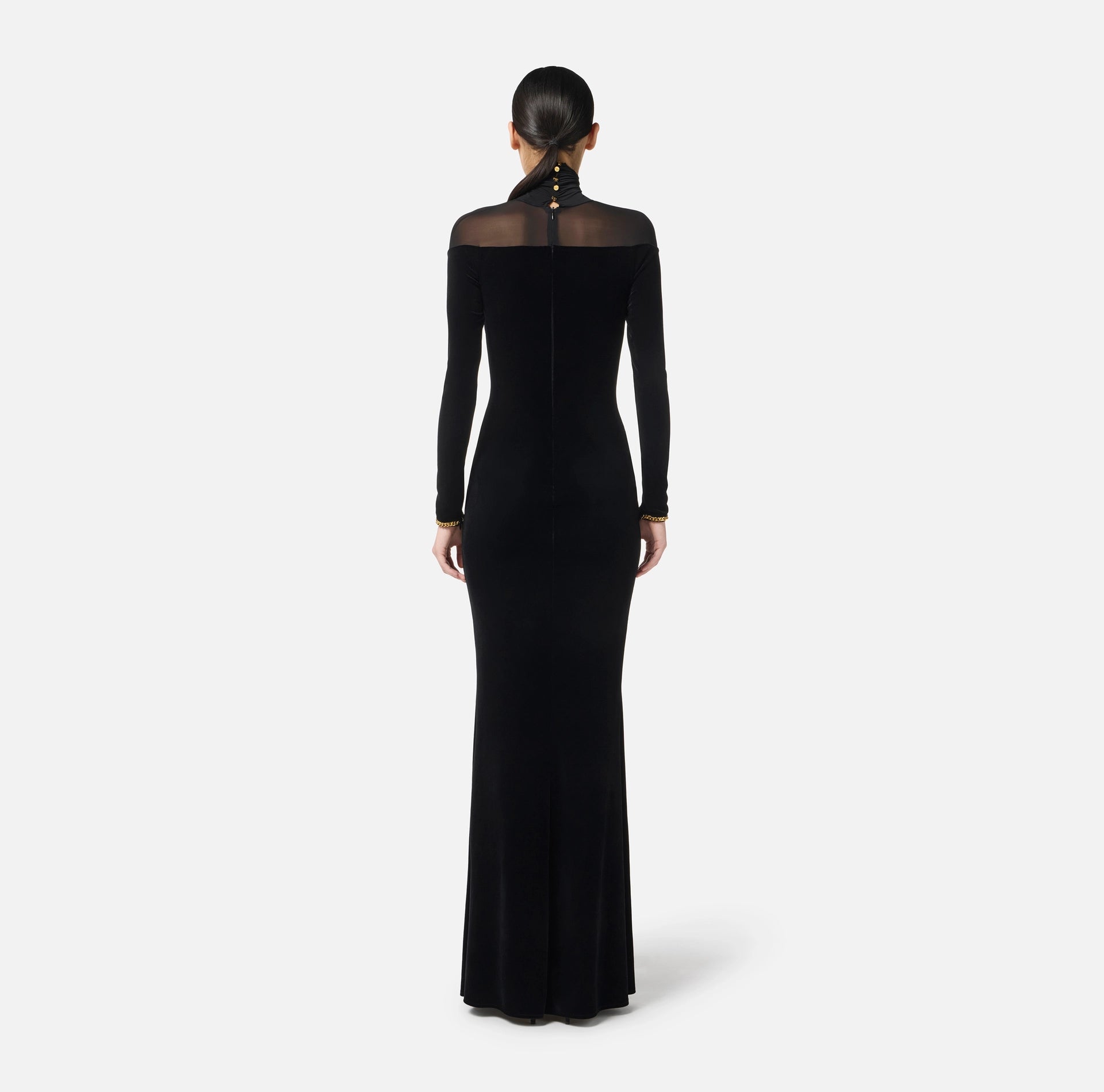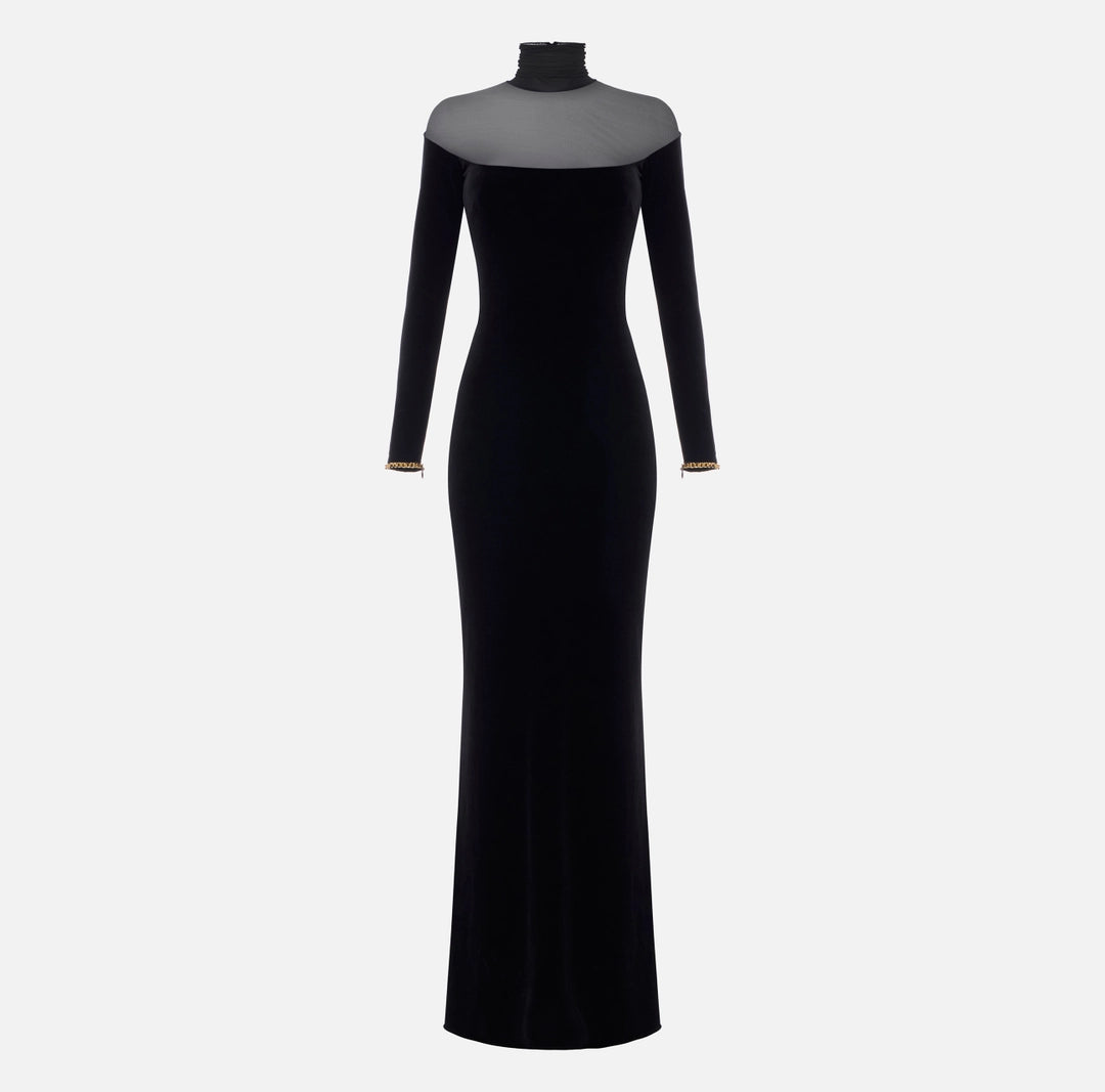 Abito da sera in velluto dalla vestibilità aderente. Il vestito si distingue per il collo alto e le spalle realizzate in jersey semi-trasparente. Impreziosito dai dettagli gioiello in catena che illuminano i polsi. Dalla linea avvolgente, ha gonna leggermente a sirena che regala un andamento sensuale.