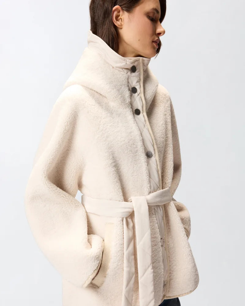 Cappotto corto dalla silhouette caban dotato di ampio cappuccio e realizzato in morbida similpelliccia effetto teddy abbinata a dettagli in tela tecnica, per un look capace di unire stile e funzionalità. Il capo è completo di cintura abbinata, nello stesso tessuto, da annodare in vita. Chiusura con bottoni metallici a pressione.