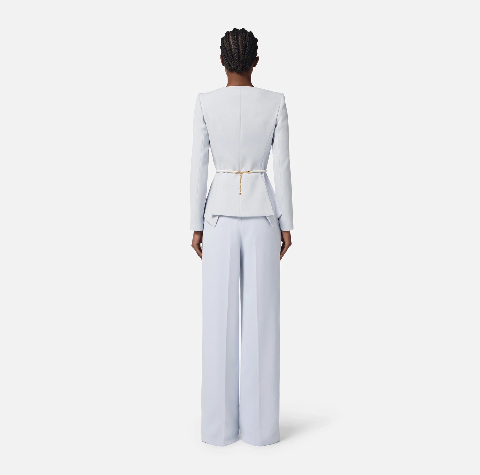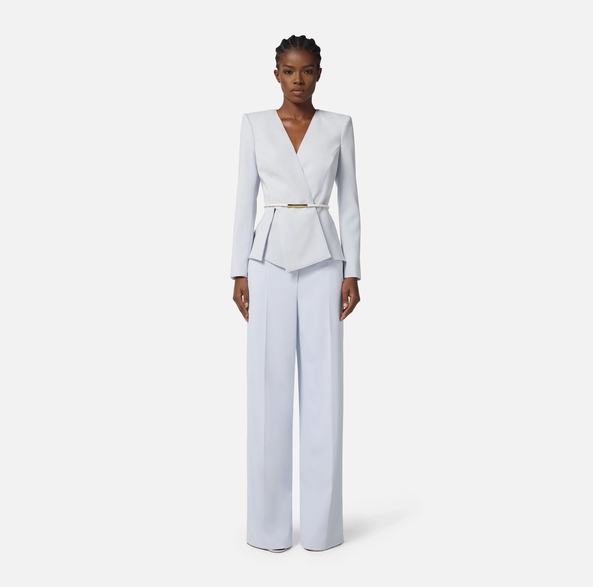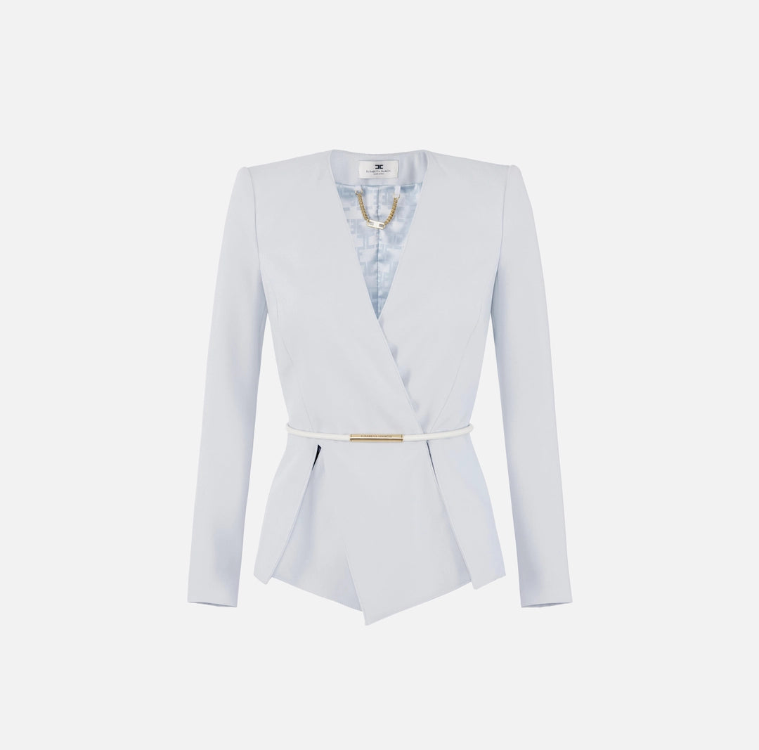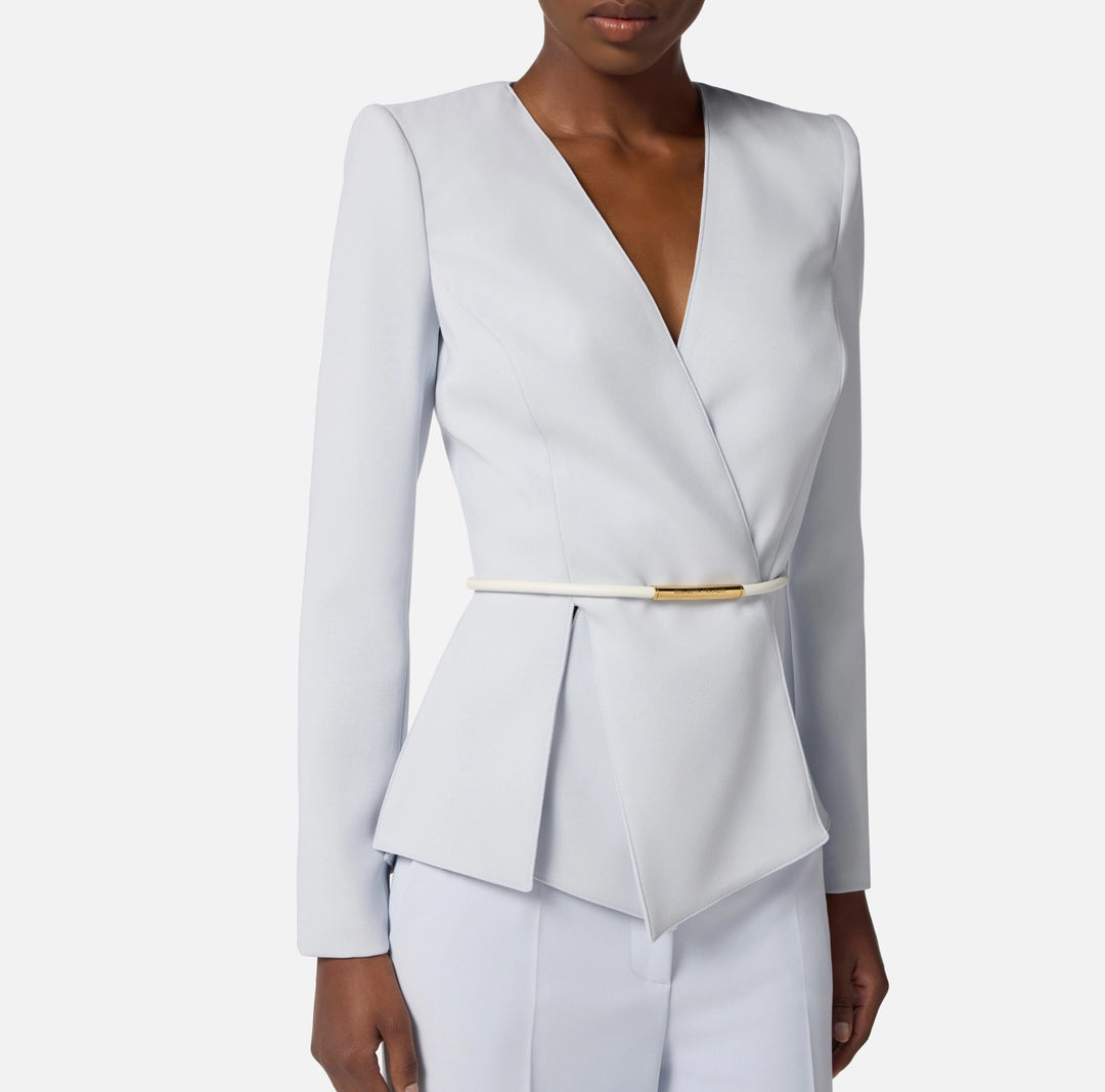 Giacca in crêpe leggero dalla vestibilità slim. Ha spalle strutturate e scollo incrociato con ampi spacchi al fondo che creano una baschina. La cintura tubolare posizionata in vita regala un tocco di luce.