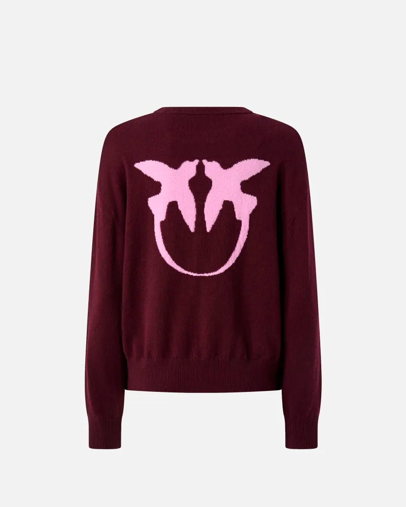 Maglione girocollo a maniche lunghe in pregiato misto lana e cashmere. L'inimitabile stile del brand viene espresso al massimo in questo capo, arricchito dal maxi logo Love Birds sul retro e dal logo lettering PINKO a contrasto sul davanti, lato cuore. Il capo è stato sottoposto a prove di finissaggio per ridurre al minimo la possibile formazione di pilling, garantendo una maggiore morbidezza e durabilità del tessuto. Il design è completato da girocollo, orlo e polsini lavorati a costine