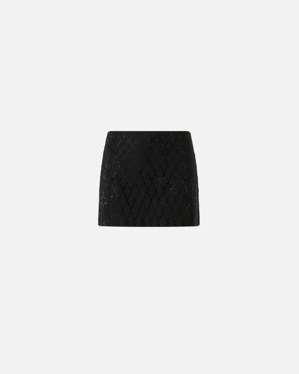 Minigonna aderente con zip sul retro. Il design presenta un'applicazione di strass di diverse misure e forme che crea un sofisticato disegno geometrico all over. La lavorazione dona al capo un effetto luminoso e prezioso che eleva l'essenzialità della silhouette. Opta per un total look scintillante e raffinato con la giacca abbinata per le occasioni più speciali.