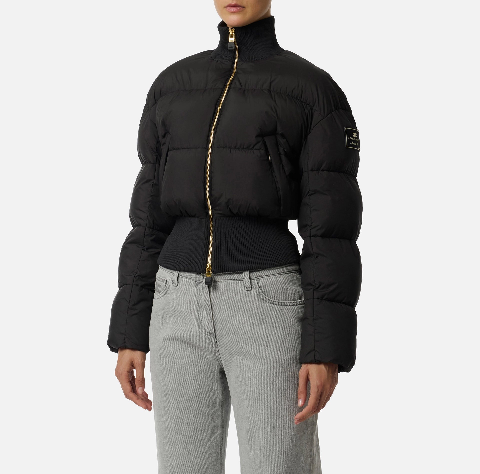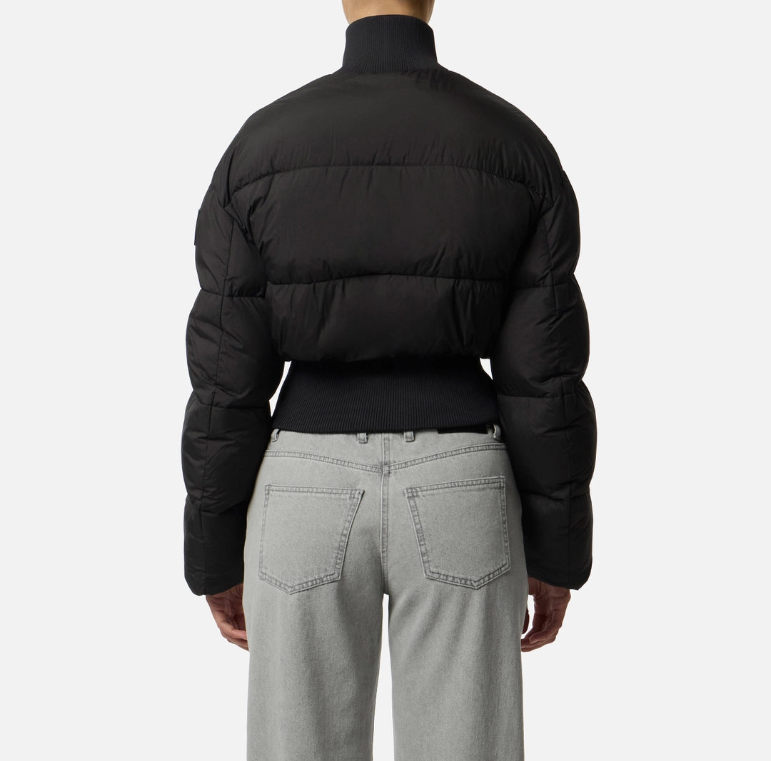Piumino cropped in tessuto tecnico dalla vestibilità over. Voluminoso e femminile, presenta colletto e fascia elastica in vita realizzati in maglia, tasche a filetto con zip e chiusura con zip. La patch in tono ricamata con logo su una manica completa il capo.
